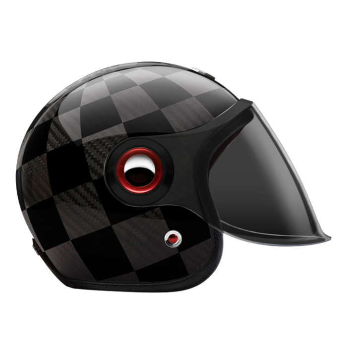 The large, integrated screen gives the helmet a subtle retro-futuristic character, echoing 1960s robots and science-fiction heroes, while remaining compact on the head. Each helmet combines a vintage-inspired silhouette with modern materials and current safety standards.